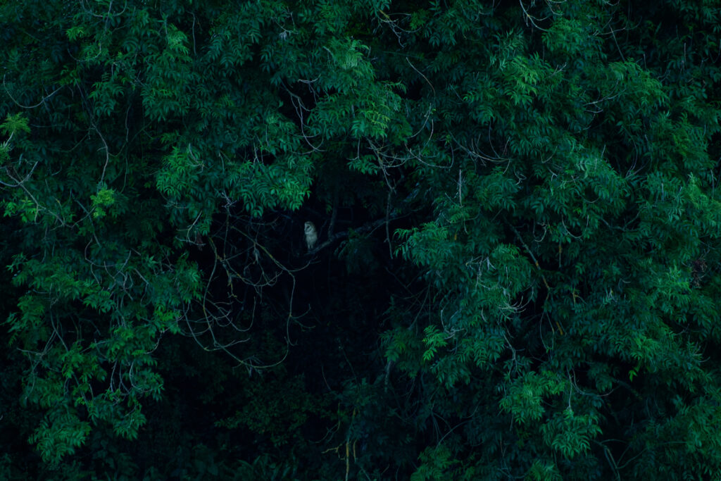 Environmental shot of a Barn Owl in a large tree.
